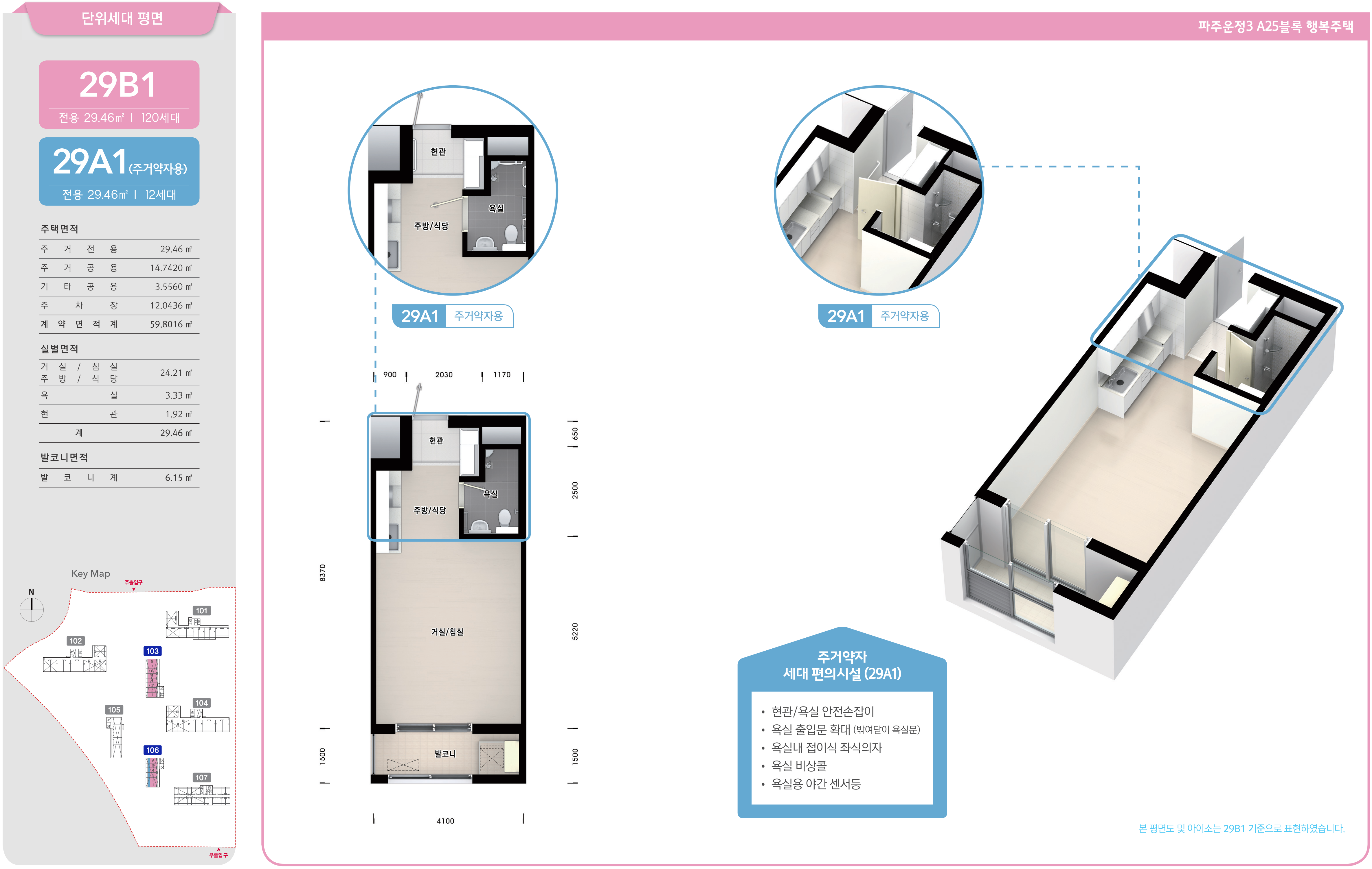 이와 함께 주거약자용 주택으로 12세대가 공급되는 29A1형에는 「공공주택 업무처리지침」에 따라 현관과 욕실의 안전손잡이, 센서보행등과 응급 비상콜, 욕실의 좌식 샤워시설과 접이식 좌식의자, 욕실 출입문 규격 확대 및 밖여닫이문 시공 등 세대내 편의시설을 설치하여 공급됩니다.