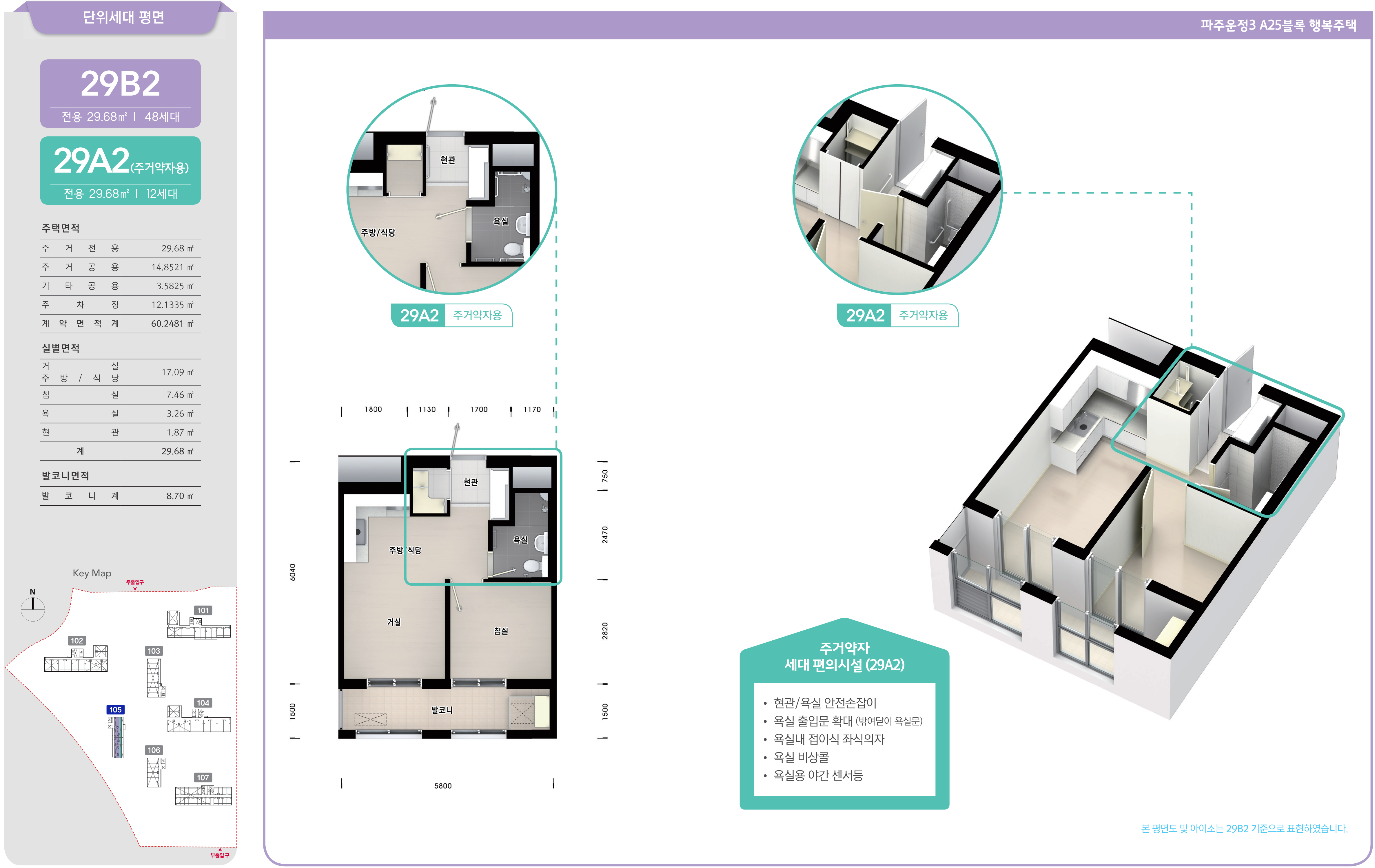 이와 함께 주거약자용 주택으로 12세대가 공급되는 29A2형에는 「공공주택 업무처리지침」에 따라 현관과 욕실의 안전손잡이, 센서보행등과 응급 비상콜, 욕실의 좌식 샤워시설과 접이식 좌식의자, 욕실 출입문 규격 확대 및 밖여닫이문 시공 등 세대내 편의시설을 설치하여 공급됩니다.