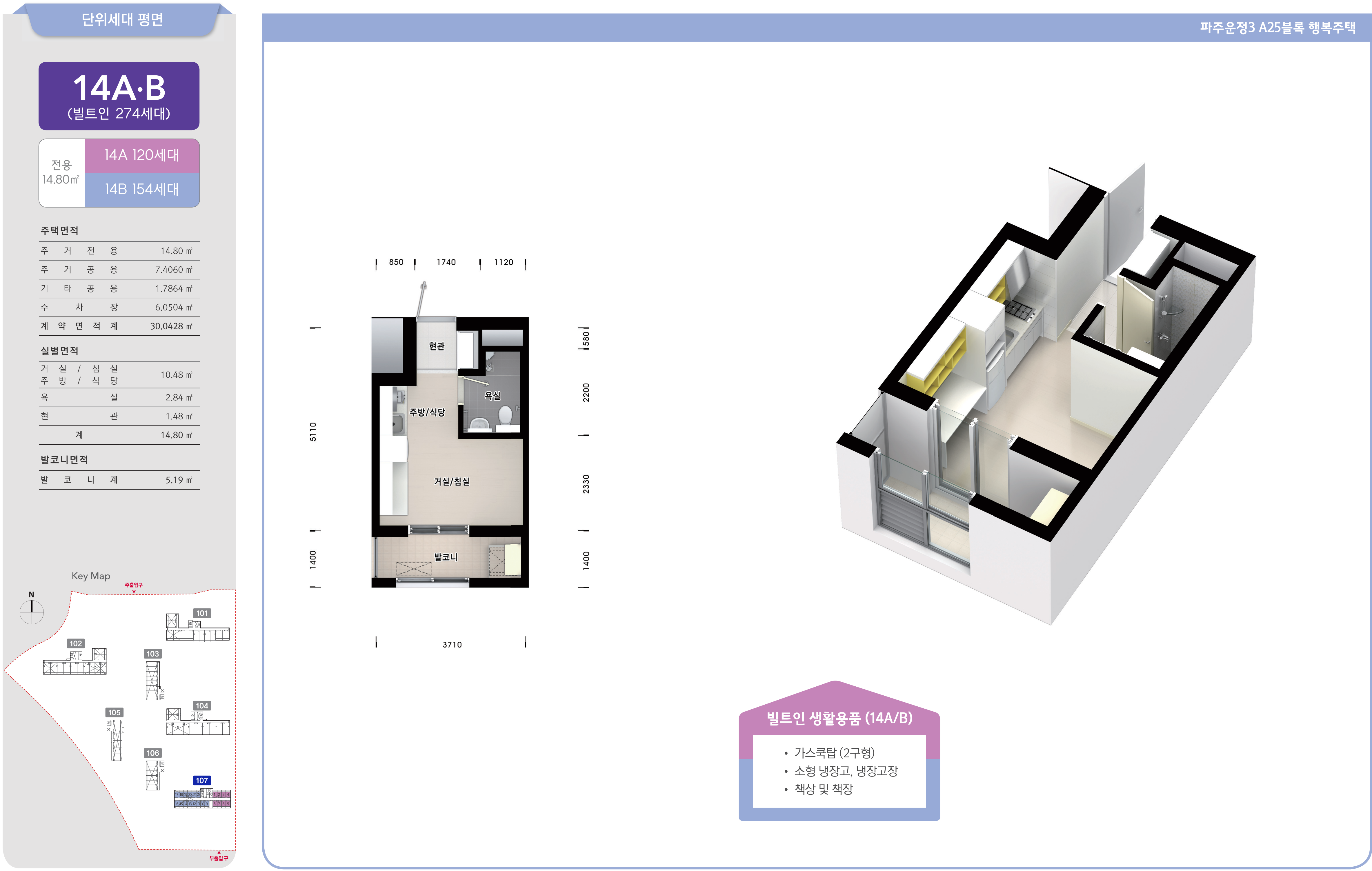 파주운정3 A25블록 행복주택 LH 초롱꽃마을 10단지 아파트 전용면적 14㎡의 14A형과 14B형은 서비스 면적으로 제공되는 주거공용 면적을 포함하여 舊, 평형으로 환산하면 약 6.717평으로, 주방/식당과 거실/침실이 일체형으로 되어 있고, 욕실과 실외기 설치 공간이 내부에 있는 발코니 등으로 구성되어 있는 1베이 원룸형 구조이며, 빌트인으로 2구형 가스쿡탑과 소형 냉장고, 냉장고장과 식탁 겸용으로 사용할 수 있는 책상, 책장 겸 오픈 장식장 등의 생활용품이 시공·설치되어 공급됩니다.