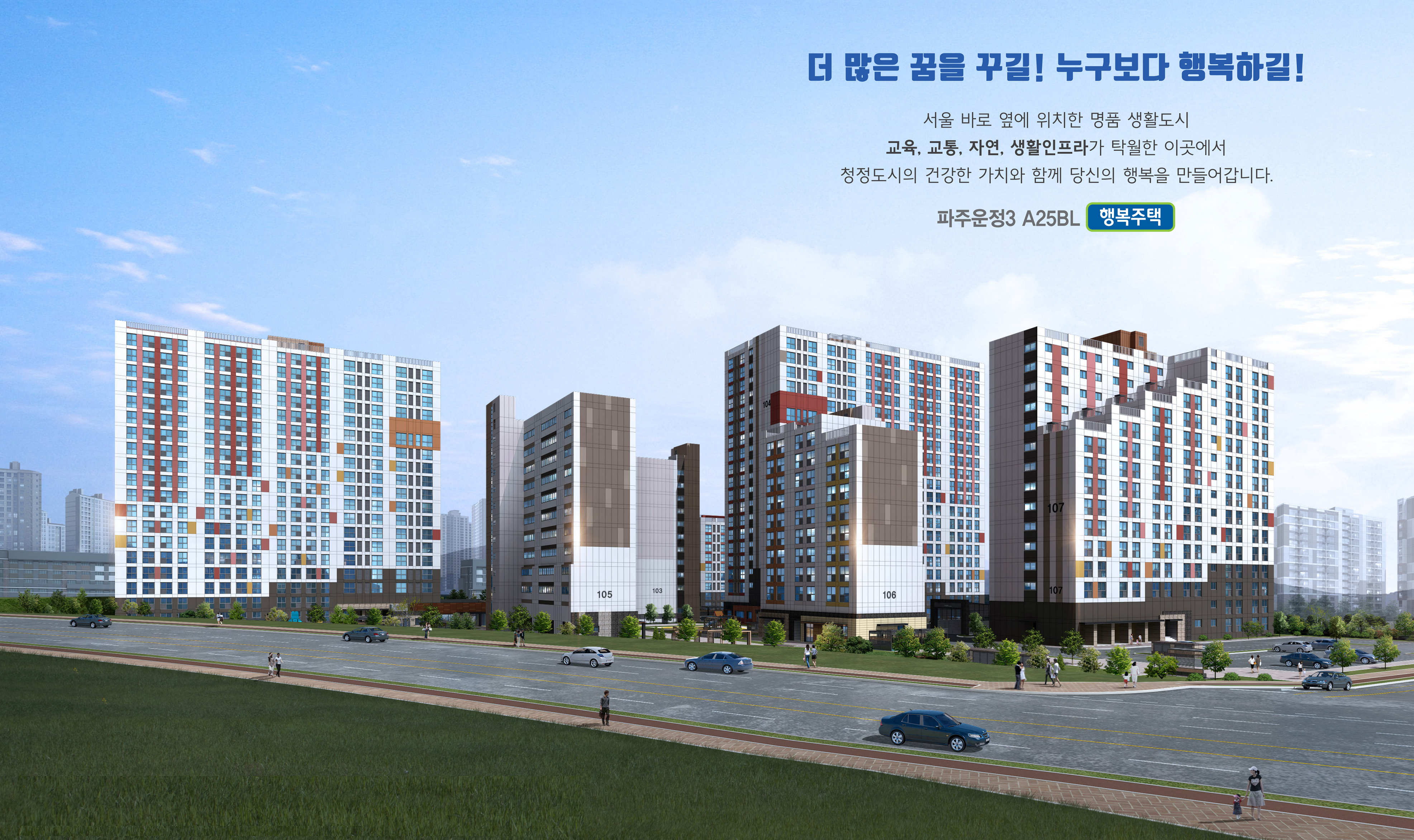 한국토지주택공사에서 공급하는 파주운정3 A25블록 행복주택 LH 초롱꽃마을 10단지는 경기도 파주시 양지로 112 [㉾10888] (舊, 지번주소: 경기도 파주시 동패동 1218번지)에 위치해 있는 지역난방 방식의 아파트 단지로, 2021년 03월에 입주가 시작되었습니다. LH공사에서 행복주택으로 공급하는 파주운정3지구 A25블록 LH 초롱꽃마을 10단지는 9층 ~ 19층 규모의 1001동 ~ 1007동 까지 7개동 전용면적 14㎡의 14A형 120세대와 14B형 154세대, 29㎡의 29A1형 12세대와 29A2형 12세대, 29B1형 120세대와 29B2형 48세대, 36㎡의 36A1형 24세대와 36A2형 16세대, 36B1형 214세대와 36B2형 48세대, 44㎡의 44A형 36세대와 44B형 196세대 등 총 1,000세대로 구성되어 있습니다.