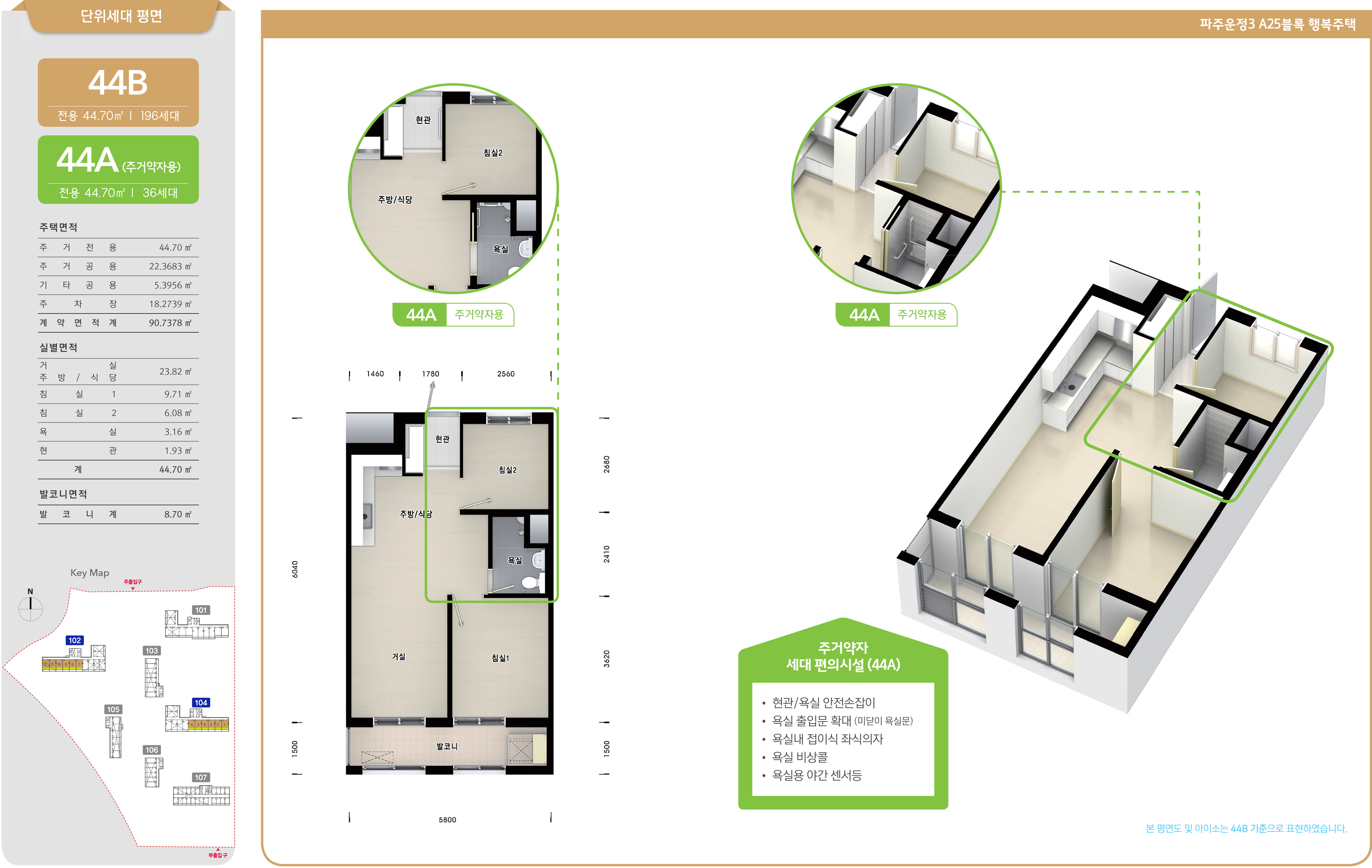 이와 함께 주거약자용 주택으로 36세대가 공급되는 44A형에는 「공공주택 업무처리지침」에 따라 현관과 욕실의 안전손잡이, 센서보행등과 응급 비상콜, 욕실의 좌식 샤워시설과 접이식 좌식의자, 욕실 출입문 규격 확대 및 밖여닫이문 시공 등 세대내 편의시설을 설치하여 공급됩니다.