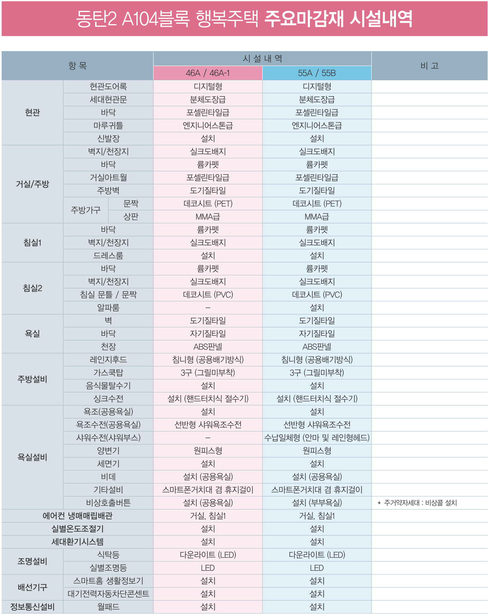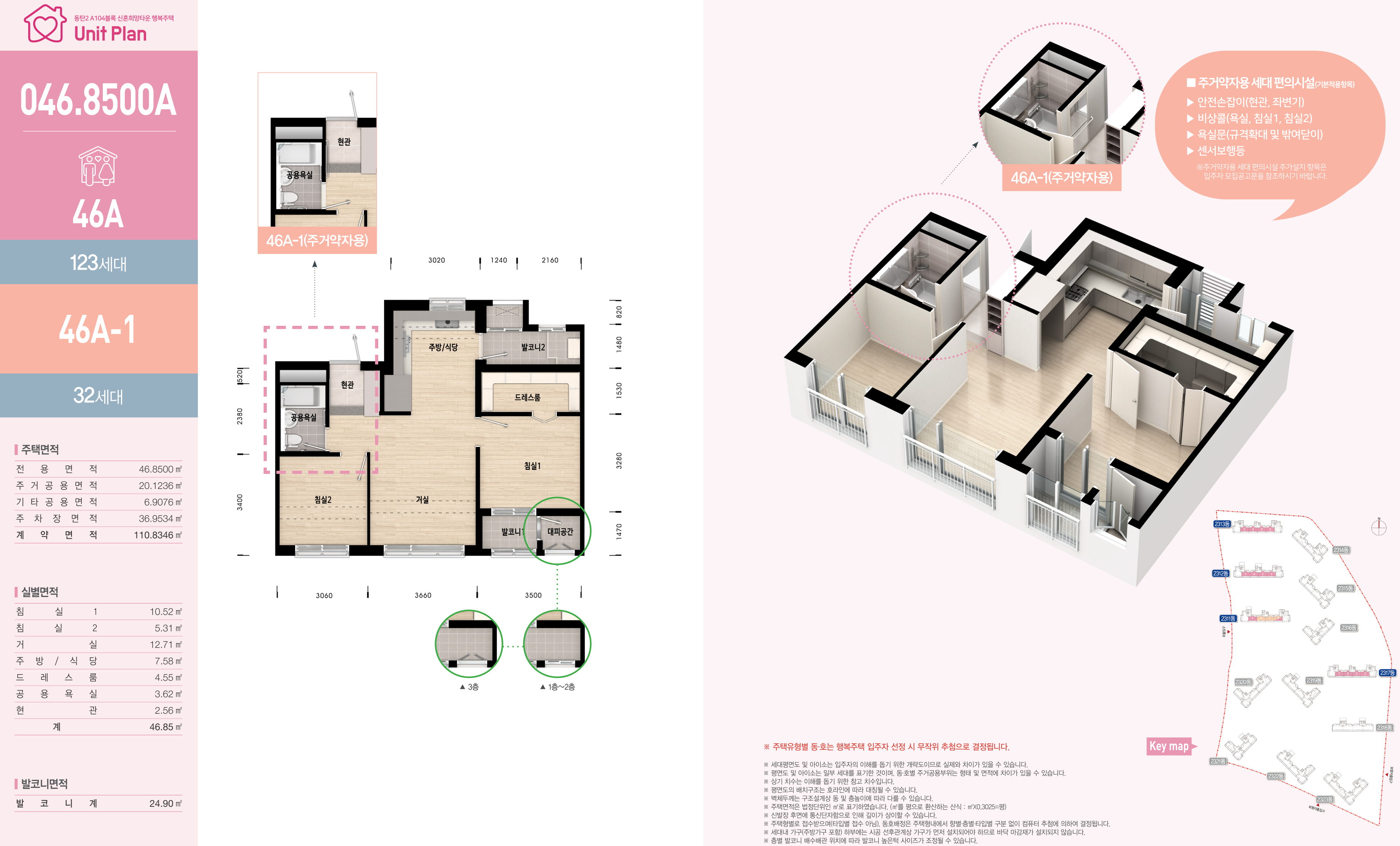 이와 함께 주거약자용 주택으로 32세대가 공급되는 46A1형은 「공공주택 업무처리지침」에 따라 현관과 욕실의 수직·수평 안전손잡이, 센서보행등과 응급 비상콜 및 동체감지기, 욕실의 높낮이 조절 좌식 샤워시설과 접이식 좌식의자, 미끄럼 방지 바닥재와 바닥단차 줄임,욕실 출입문 규격 확대 및 밖여닫이문 시공 등 세대내 편의시설을 설치하여 공급됩니다.