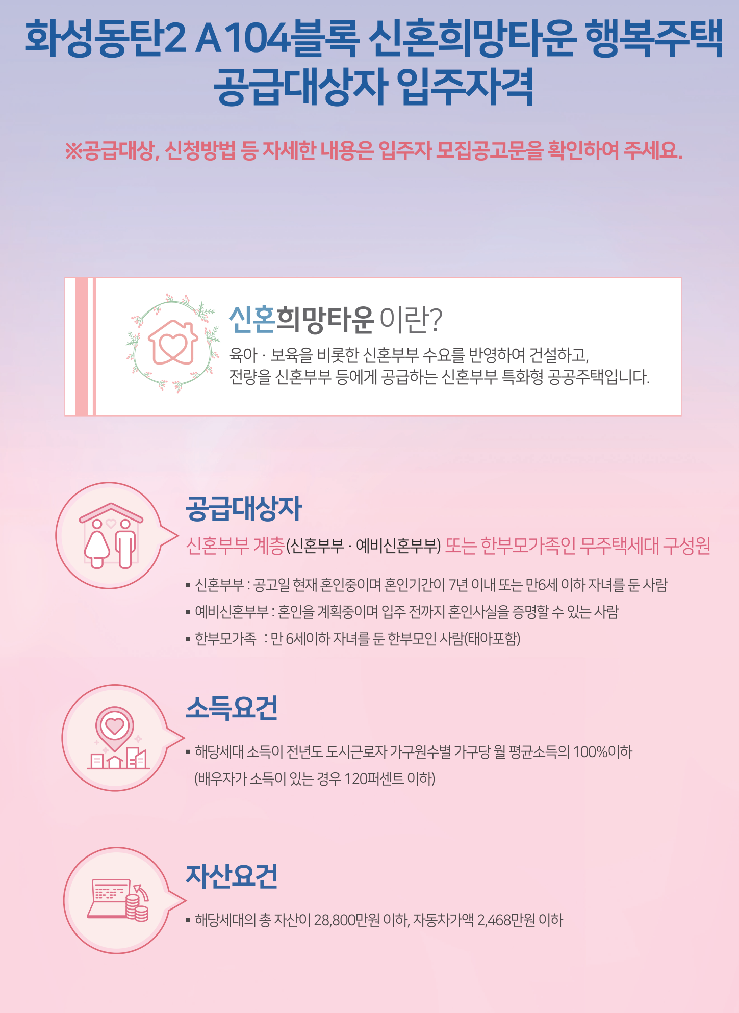 한국토지주택공사에서 공급하는 화성동탄2신도시 A104블록 신혼희망타운 행복주택 동탄2 디루체 아파트는 입주자 모집 공고일 기준 현재 혼인중이며, 혼인기간이 7년 이내에 만 6세 이하의 자녀가 있는 경우, 만 6세 이하의 자녀가 있는 한부모가족, 입주 전까지 혼인사실을 증명할 수 있는 예비신혼부부 등이 입주할 수 있으며, 입주 후 2년 단위의 갱신 계약을 통해 자녀 유·무에 따라 6년 ~ 10년 까지 거주 할 수 있습니다.