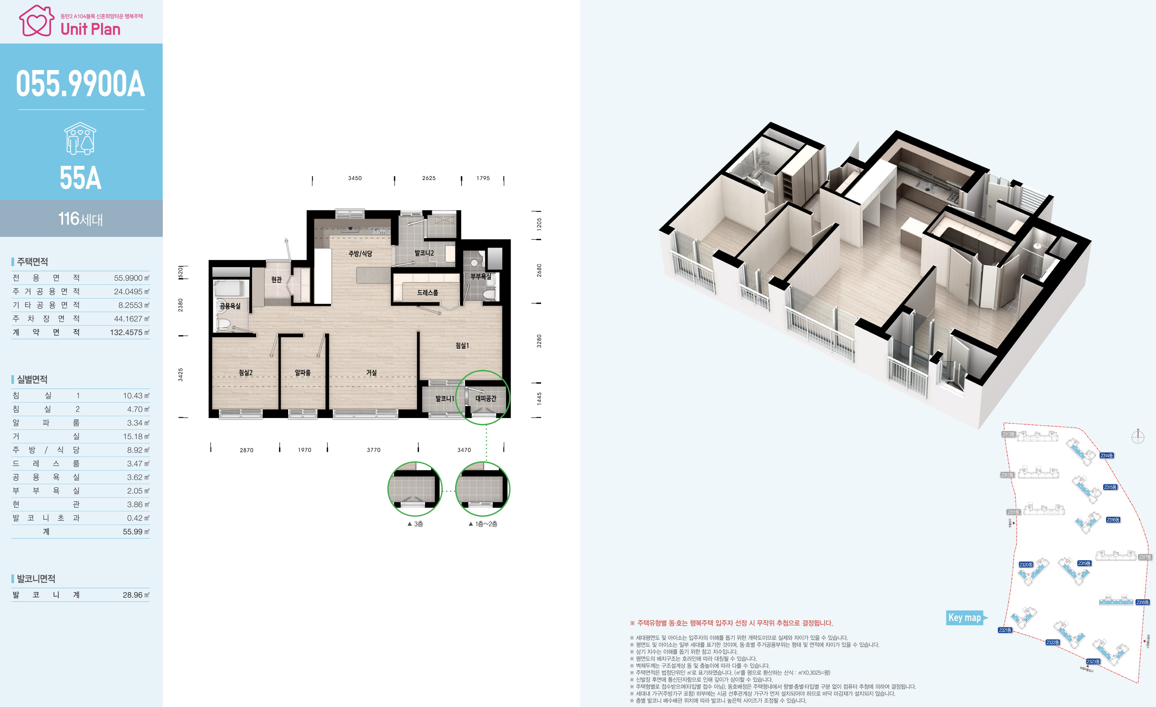 화성동탄2신도시 A104블록 신혼희망타운 행복주택 동탄2 디루체 아파트 전용면적 55㎡형의 55A형은 서비스 면적으로 제공되는 주거공용 면적을 포함하여 舊, 평형으로 환산하면 약 24.212평으로, 침실 2개와 알파룸, 드레스룸과 현관 팬트리, 주방/식당과 거실, 욕실 2개와 발코니 2개, 대피공간과 실외기실 등으로 구성되어 있는 4베이 구조에 1층 ~ 3층 사이 저층 주택에는 대피공간이 발코니1 면적으로 확장되어 공급됩니다.