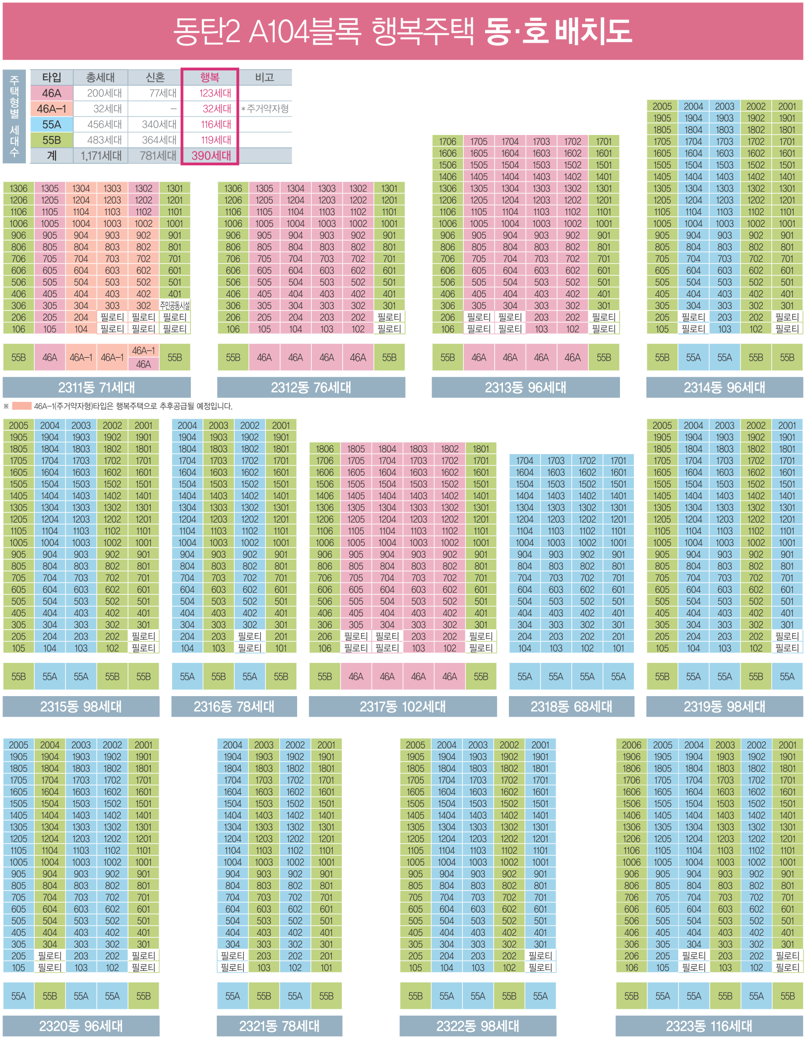 화성동탄2신도시 A104블록 신혼희망타운 행복주택 동탄2 디루체 아파트 전용면적 46㎡형의 46A형과 주거약자용 주택인 46A1형은 서비스 면적으로 제공되는 주거공용 면적을 포함하여 舊, 평형으로 환산하면 약 20.260평으로, 침실 2개와 드레스룸, 주방/식당과 거실, 욕실과 발코니 2개, 대피공간과 실외기실 등으로 구성되어 있는 3베이 구조에 1층 ~ 3층 사이 저층 주택에는 대피공간이 발코니1 면적으로 확장되어 공급됩니다.