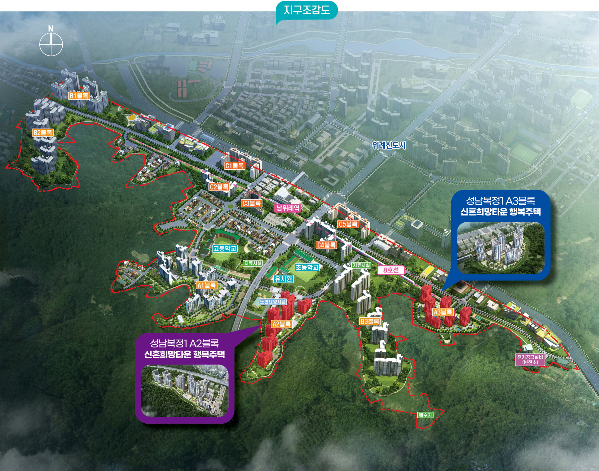 한국토지주택공사에서 공급하는 성남복정1지구 A3블록 신혼희망타운은 경기도 성남시 수정구 복정동과 창곡동 일원의 성남복정1 공공주택지구 내 A3BL에 위치해 있는 지역난방 방식의 아파트 단지로, 행복주택 105세대와 공공분양주택 210세대 등 총 315세대가 2025년 12월에 입주 예정입니다. LH공사에서 공급하는 성남복정1지구 A3블록 신혼희망타운 공공분양주택은 9층 ~ 19층 규모의 301동 ~ 306동 까지 6개동 중 전용면적 55㎡의 55A형 24세대와 55B형 72세대, 주거약자용 주택인 55BS형 9세대로 구성되어 있습니다.