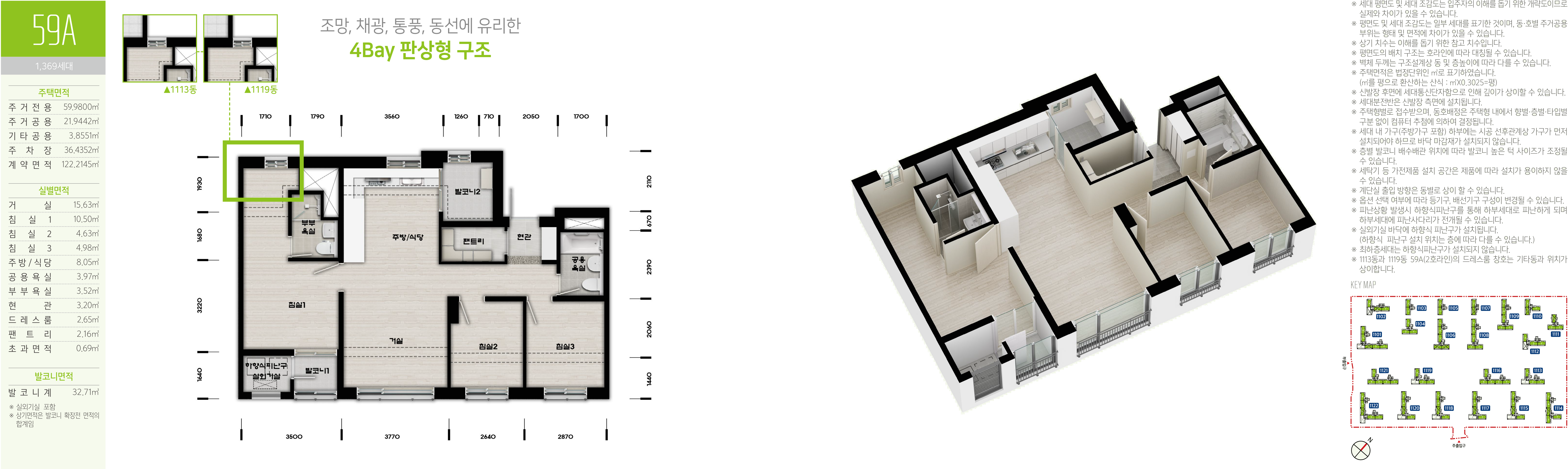 평택고덕국제화계획지구 A54블록 공공분양주택 고덕 안단테 아파트 전용면적 59㎡의 59B형은 침실 3개에 드레스룸 1개, 주방/식당과 거실, 욕실 2개에 현관 팬트리, 발코니 2개와 하향식피난구가 있는 실외기실 등으로 구성되어 있는 4베이 구조에 서비스 면적으로 제공되는 주거공용 면적을 포함하여 舊,평형으로 환산하면 약 24.778평 입니다.